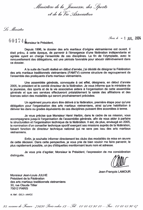 Lettre du Ministère de la jeunesse, des sports et de la vie associative.